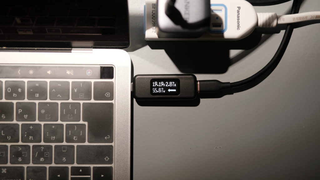 このMacBookは最大で60W入力なので、55W出ていれば十分。ただし、充電中はかなり熱を発しており、手に持っていられないほど熱くなる時もあります。持ち運ぶ際には、充電後のクールタイムが必要になりそう。重い作業中に充電等、環境によってはPC側もかなりアツアツになります。